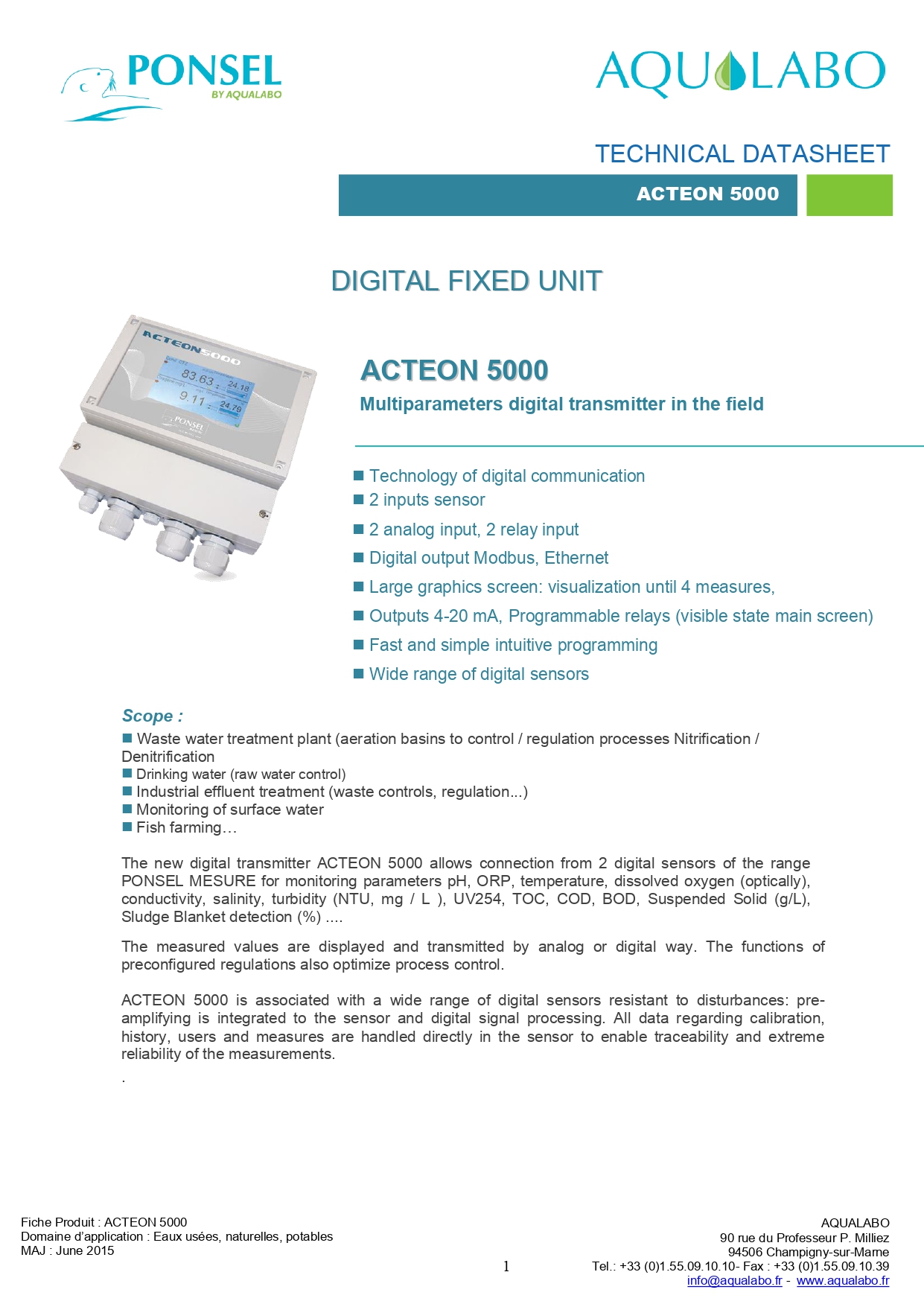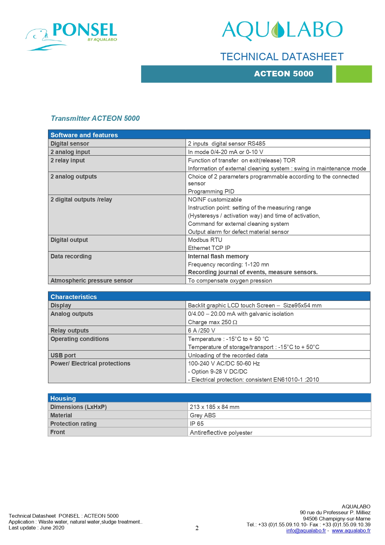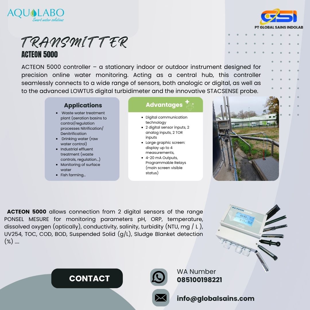 Transmitter ACTEON 5000 controller – a stationary indoor or outdoor instrument designed for precision online water monitoring. Acting as a central hub, this controller seamlessly connects to a wide range of sensors, both analog and digital, as well as to the advanced LOWTUS digital turbidimeter and the innovative STACSENSE probe.