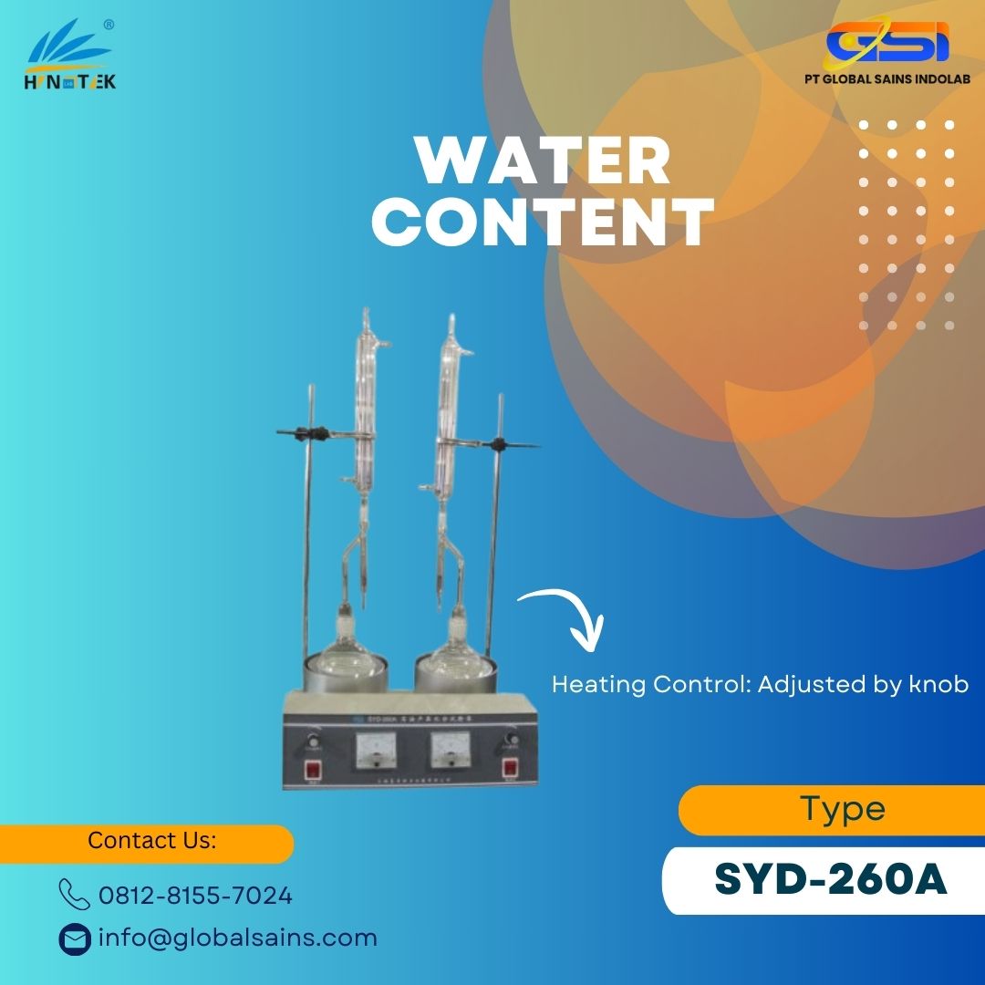 Water Content SYD260A Hinotek. This instrument is made and designed as per GB/T260 Standard Test Method for Water in Petroleum Products and ASTM D95 Standard Test Method for Water in Petroleum Products and Bituminous Materials by Distillation. This instrument is suitable to determine the water content of petroleum products according to the test method specified in GB/T260. It is also suitable to determine on product of lubricating grease according to the test method specified in GB/T 512 Test Method of Lubricating Grease. This instrument adopts a double-unit structure. It can do determination for two samples.